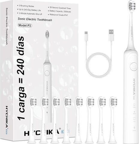 Uppladdningsbar sonisk eltandborste med upp till 240 dagars batteritid (2 500 mAh), 3 rengöringslägen, 2-minuters timer med 30-sekunders intervall och IPX7-vattentät konstruktion för effektiv daglig munvård.