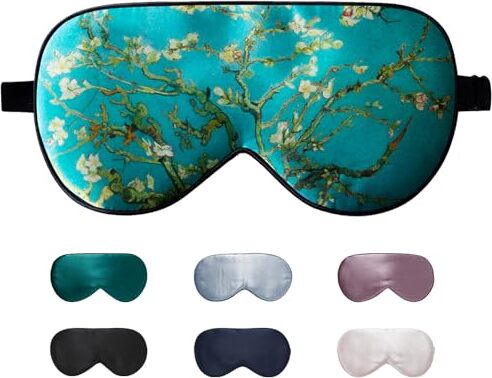 Sidenmasken är gjord av 100% mullbärssilke, allergivänlig och blockerar ljus effektivt för bättre sömn. Justerbart band och ventilerande material ger komfort året om.