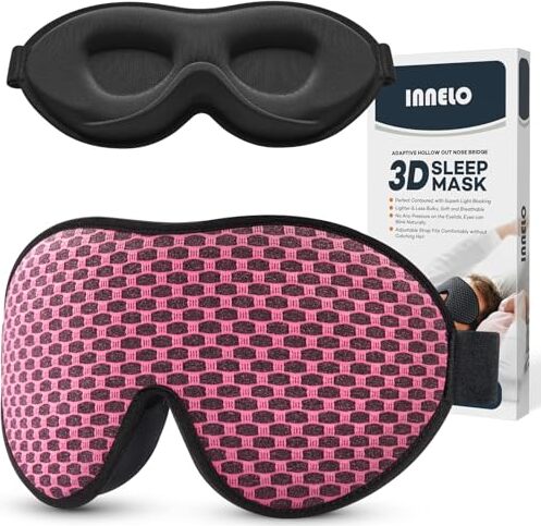 Sovmask med unik 3D-design för optimal komfort för ögonfransar. Den blockerar ljus effektivt och är tillverkad av mjukt, andningsbart material för en lugn och avslappnande sömn.